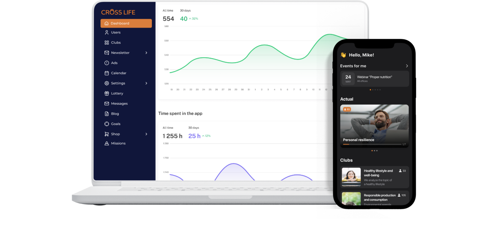 Забота о благополучии сотрудников по 5-ти направлениям: физическое, ментальное, профессиональное, финансовое, социальное. Всё это в мобильном приложении под вашим брендом.